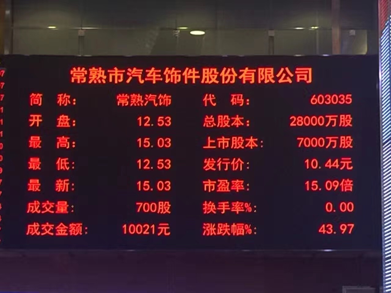 2017年1月5日,常熟市汽車飾件股份有限公司(股票代碼:603035,以下簡稱“常熟車飾”)登陸上海證券交易所,正式掛牌交易。