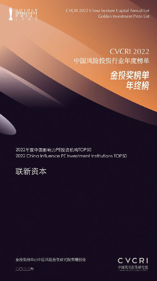 1月10日,CVCRI·2022中國風險投資行業年度榜單?金投獎榜單?年終榜隆重揭曉,聯新資本榮獲2022年度中國影響力PE投資機構TOP50。